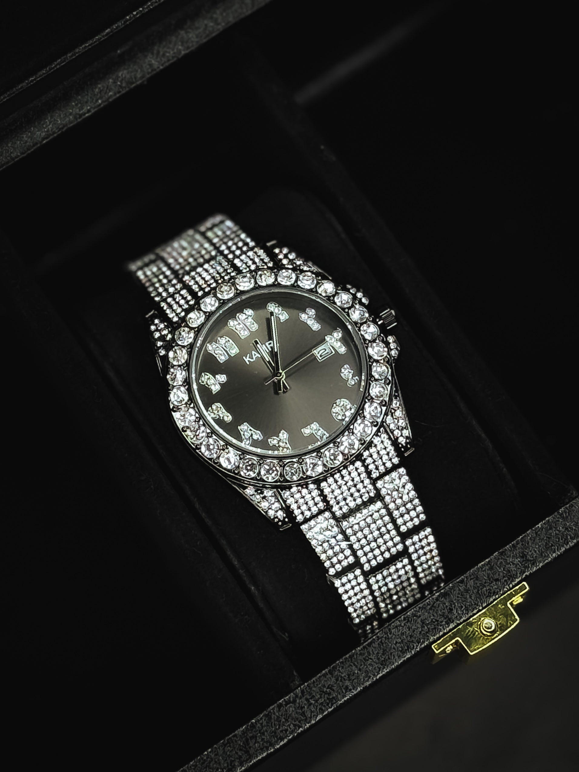 π Fully iced-out design β Covered in shimmering stones from dial to strap for max shine.