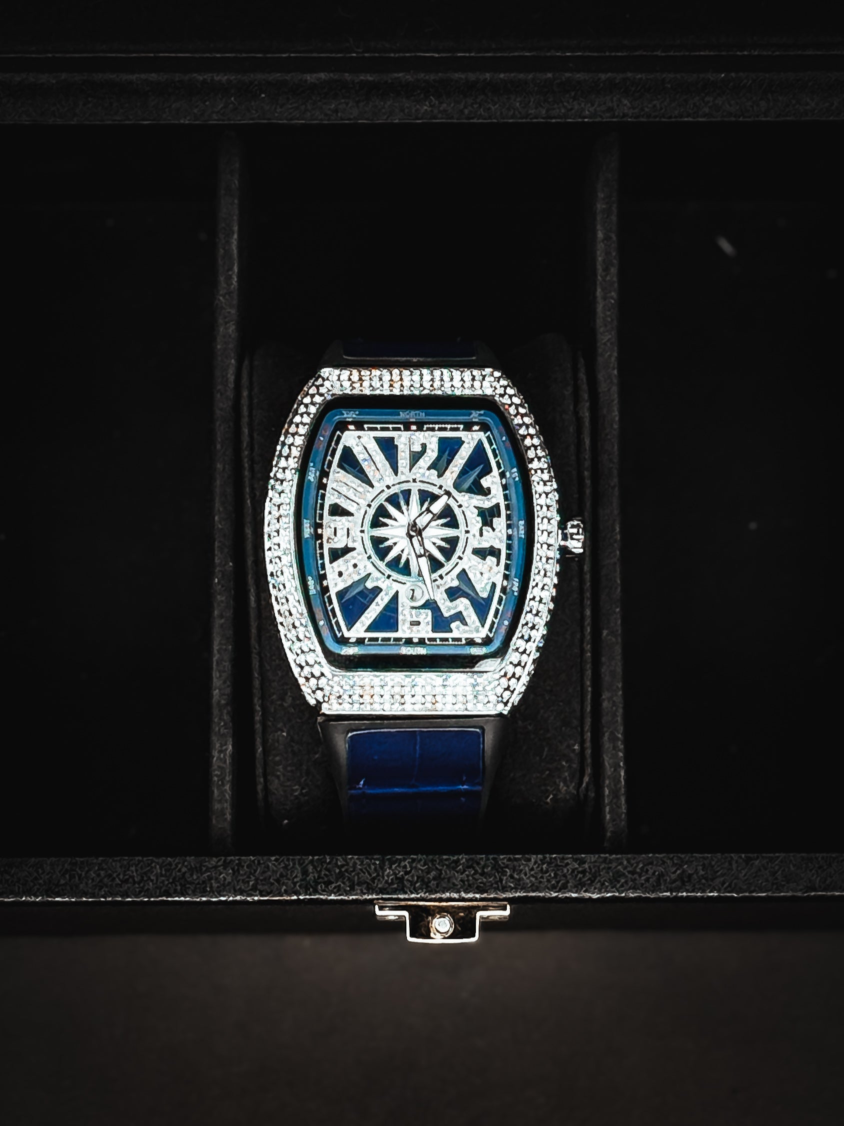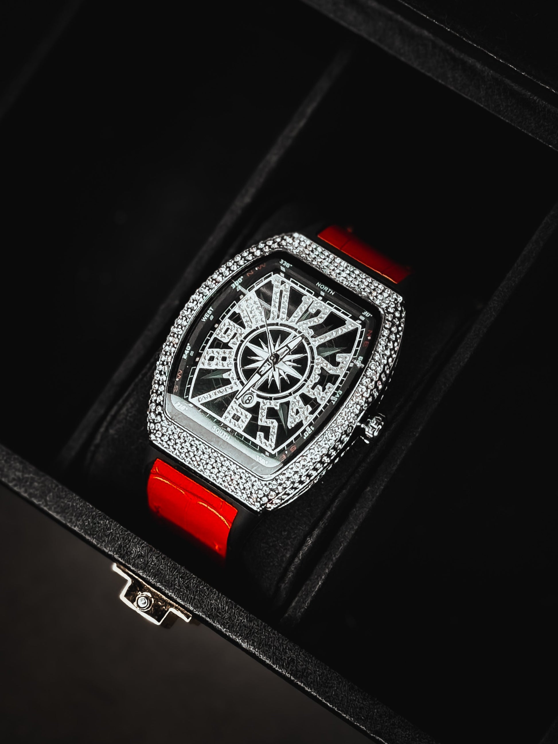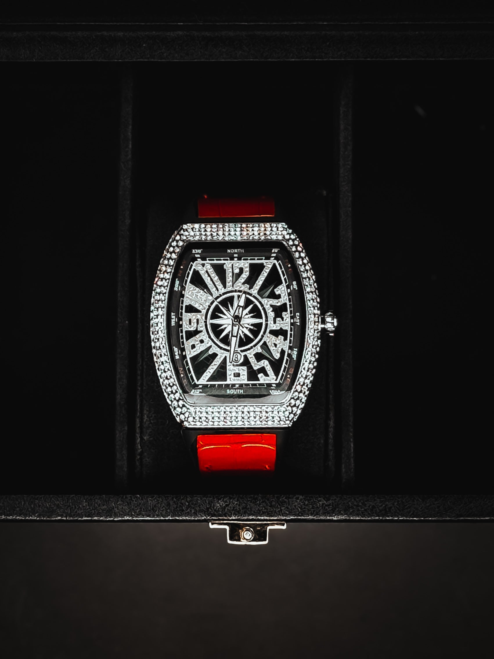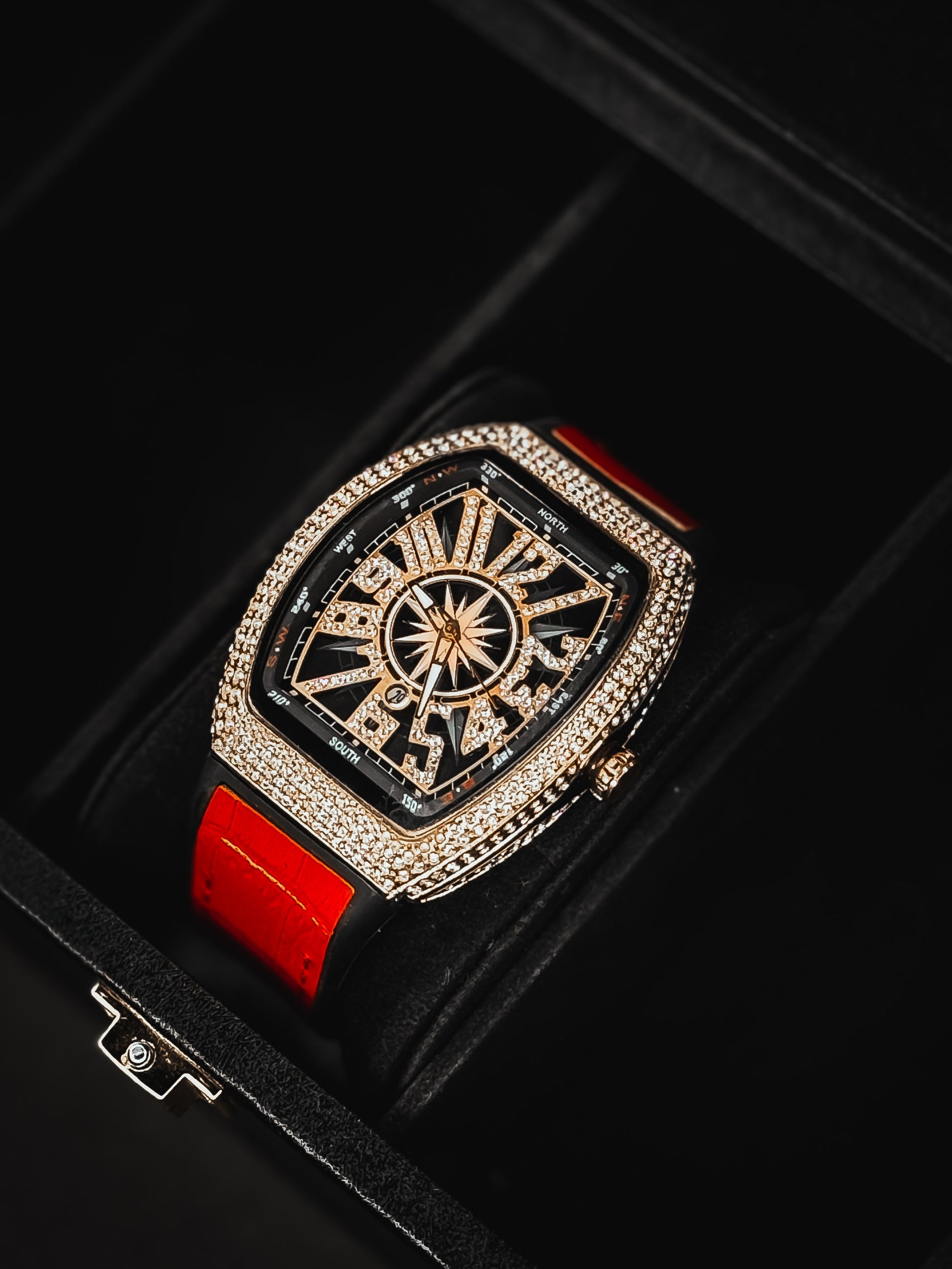 Iced dial dripping in luxury, available in Black, Gold, Blue & Red.