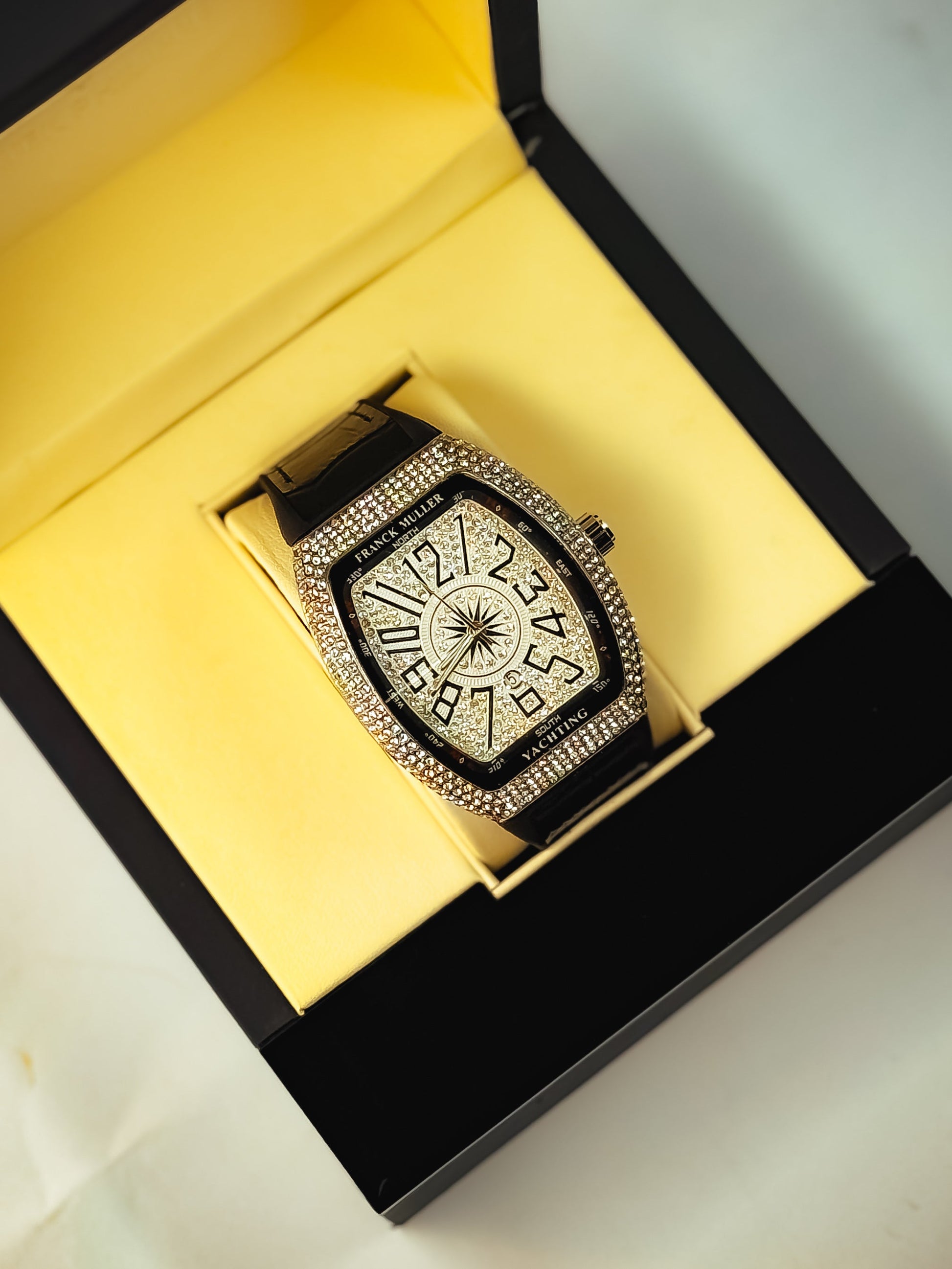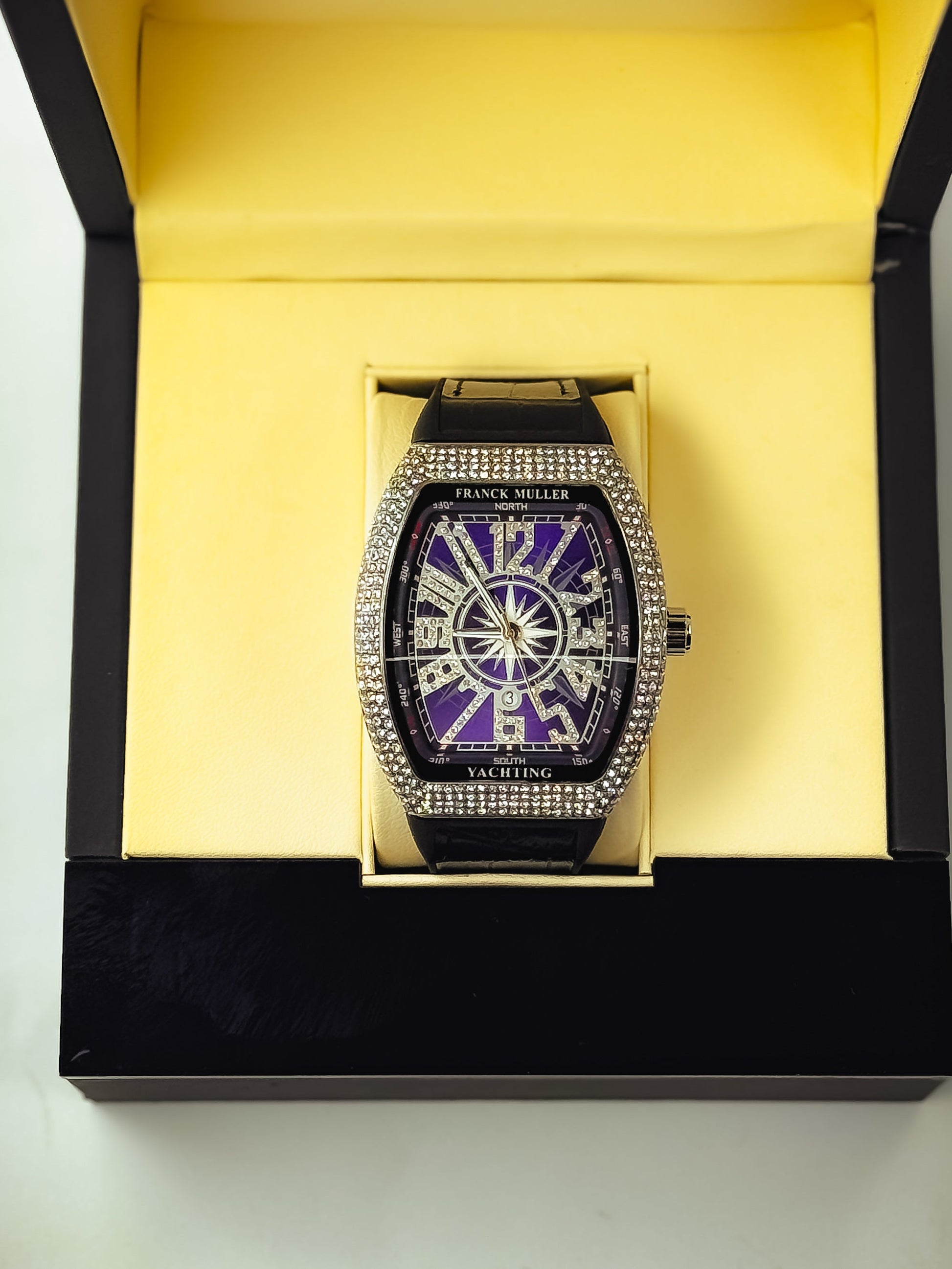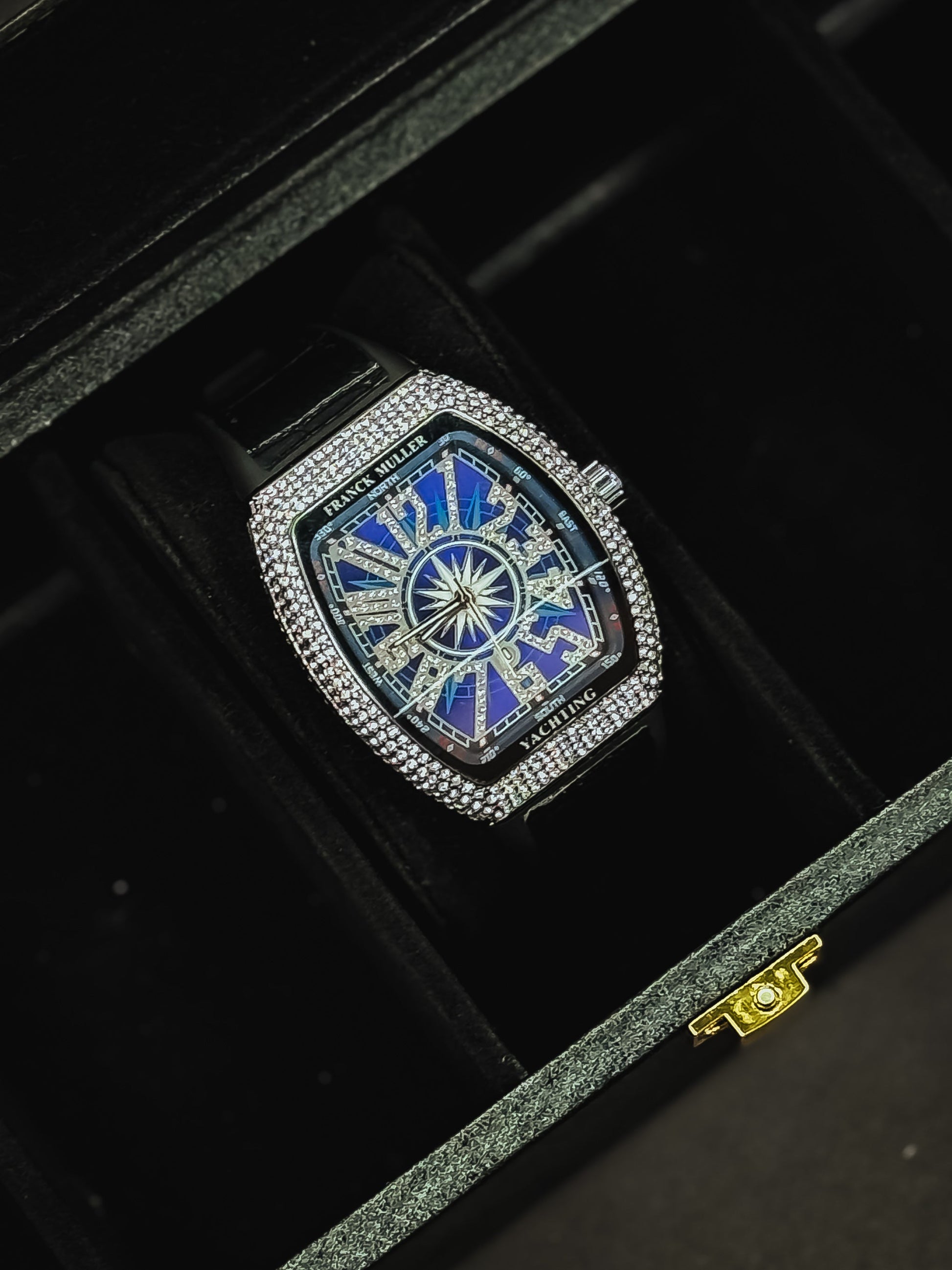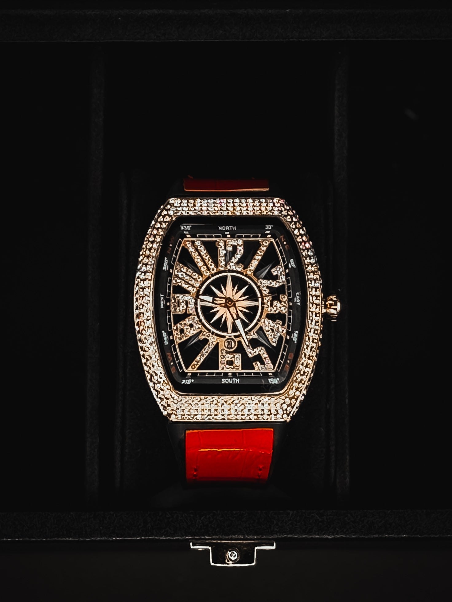 Iced dial dripping in luxury, available in Black, Gold, Blue & Red.