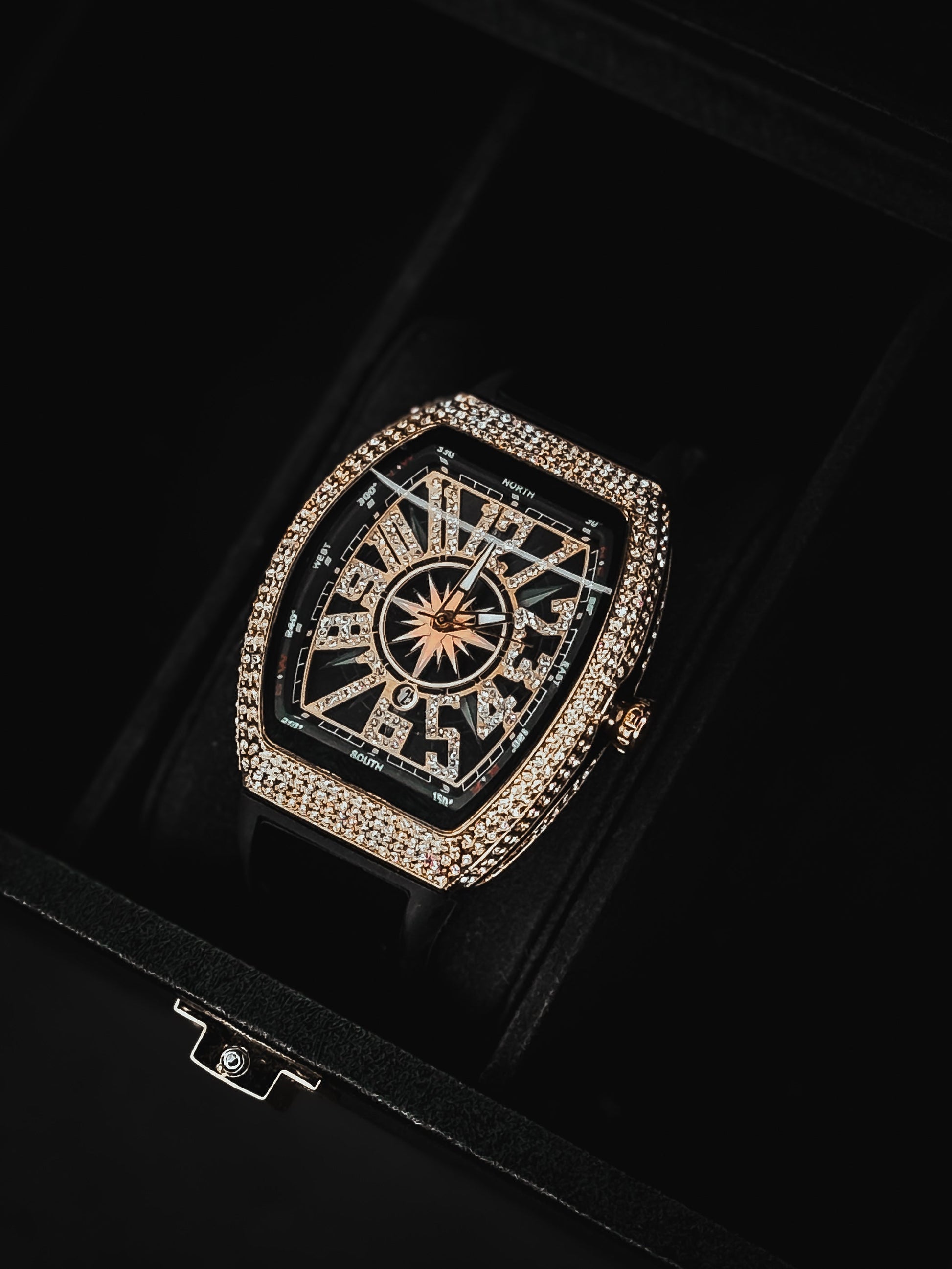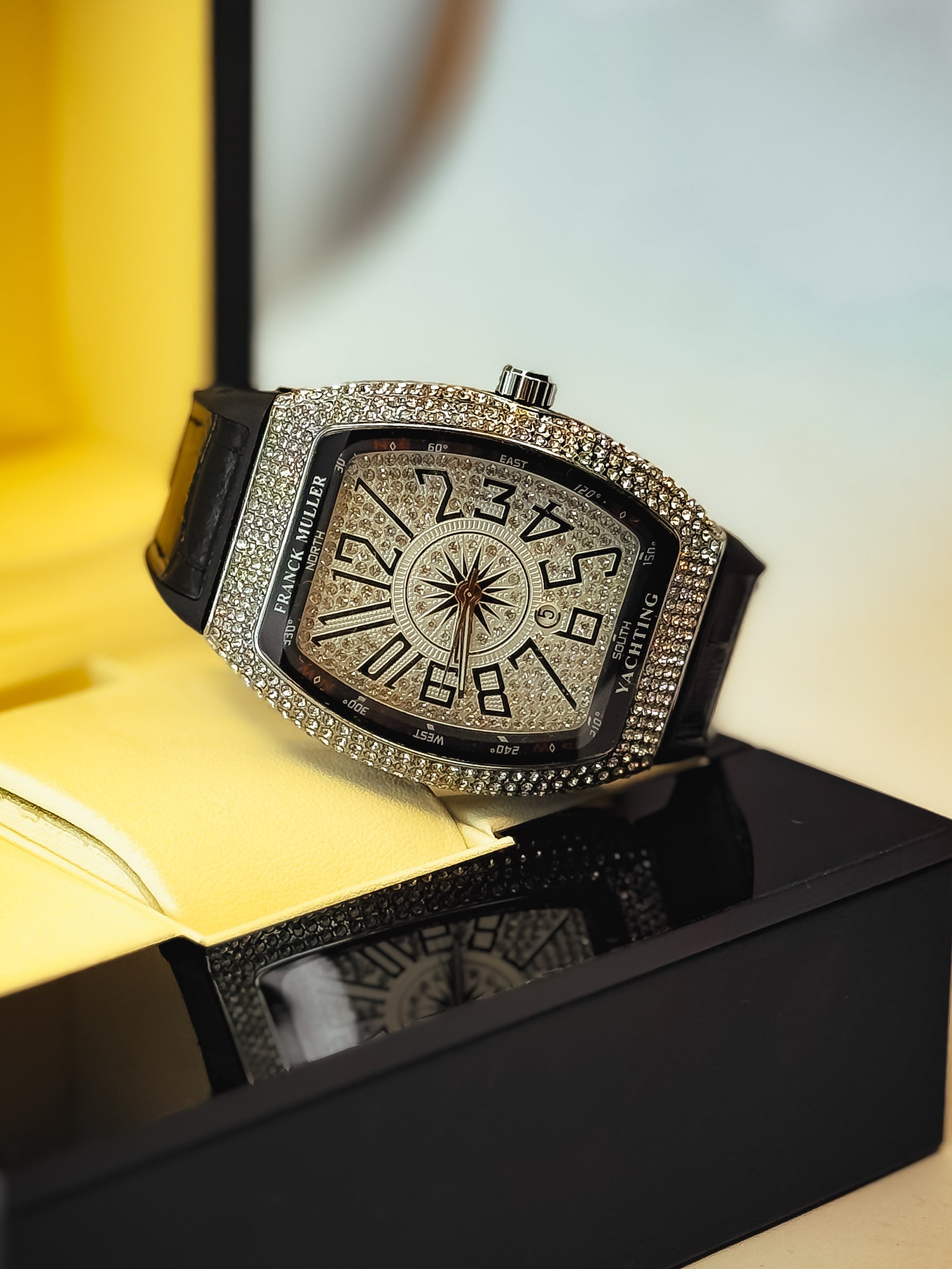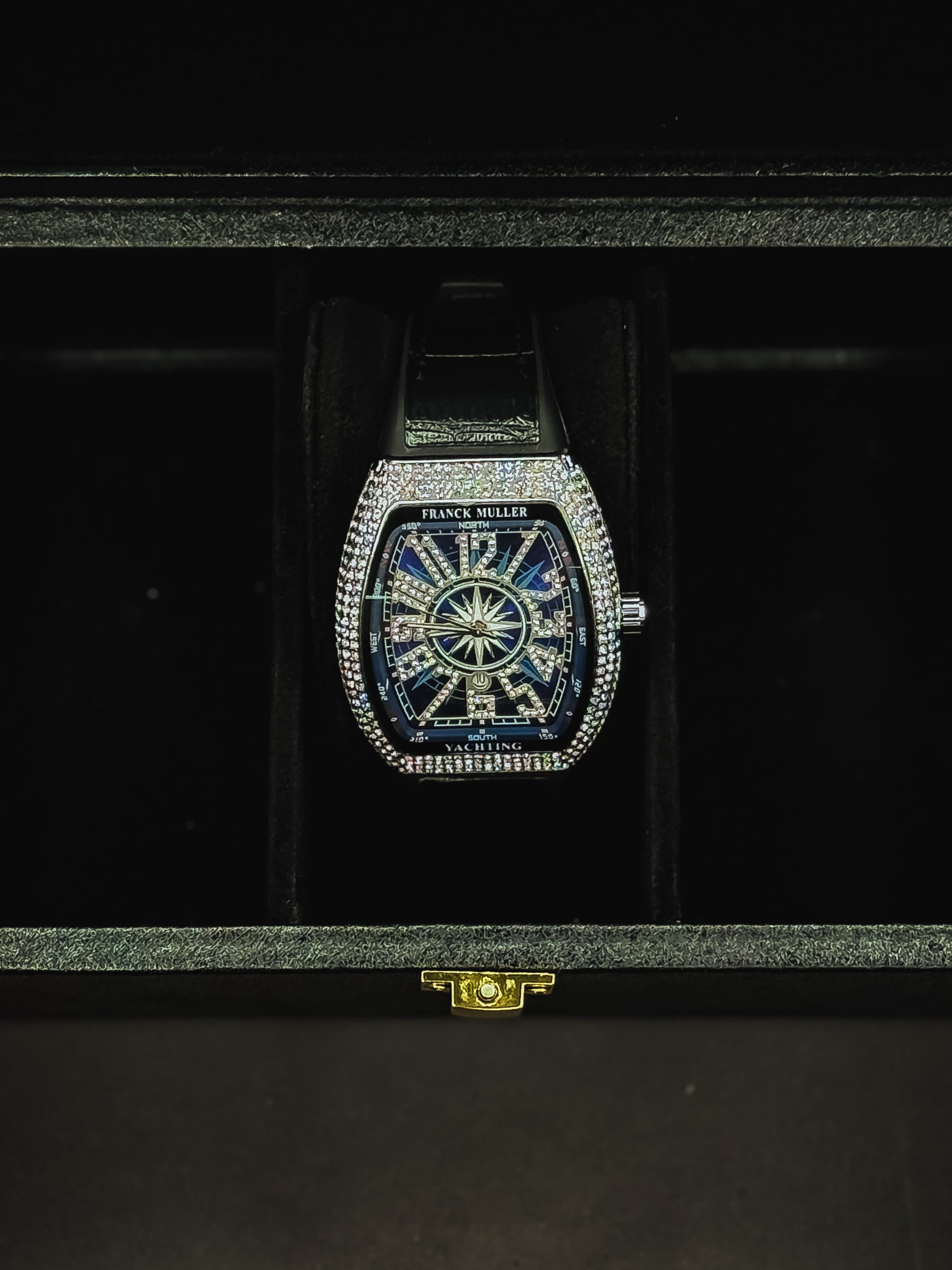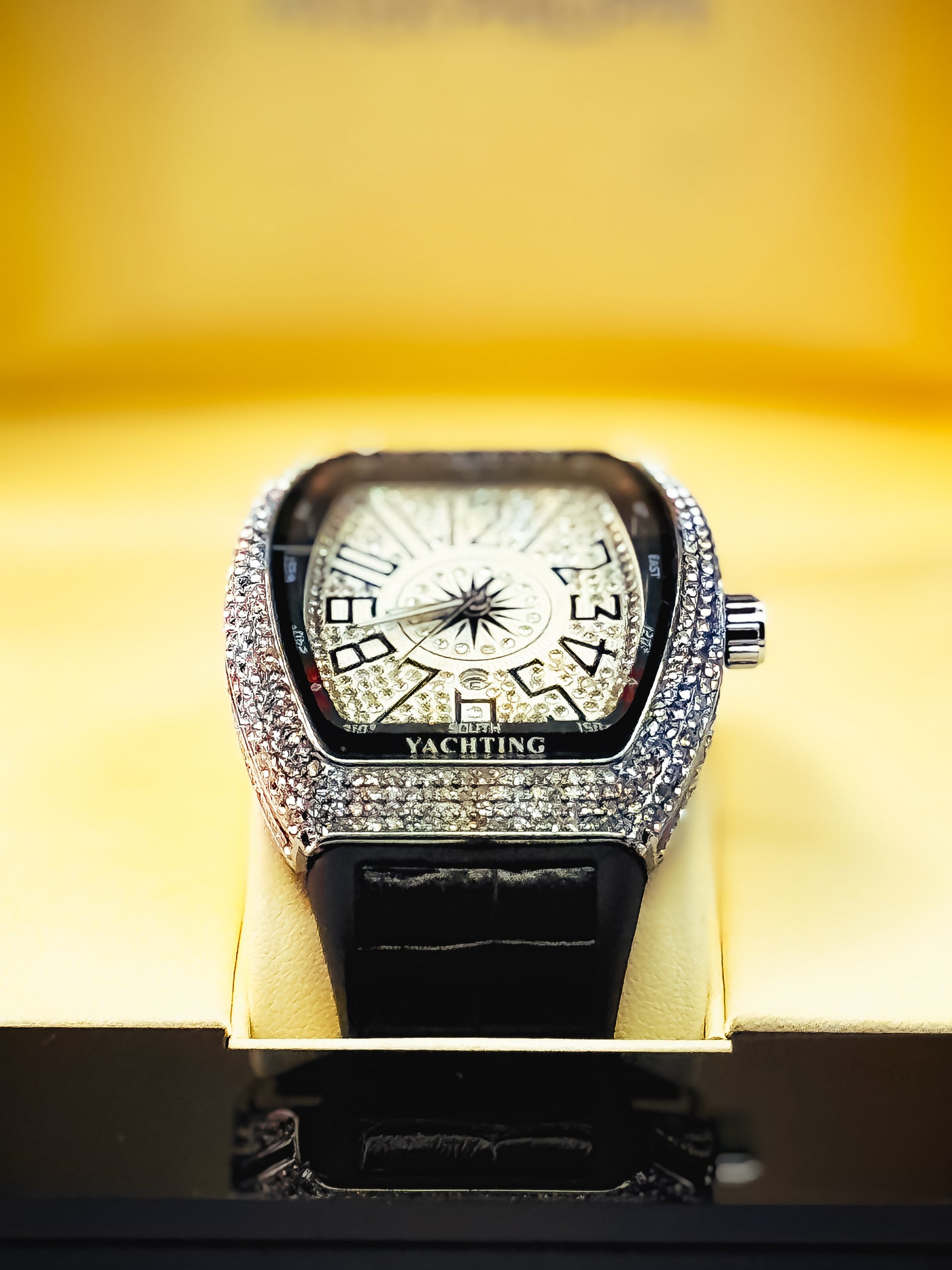 Diamond-drenched dial made to blind the crowd.