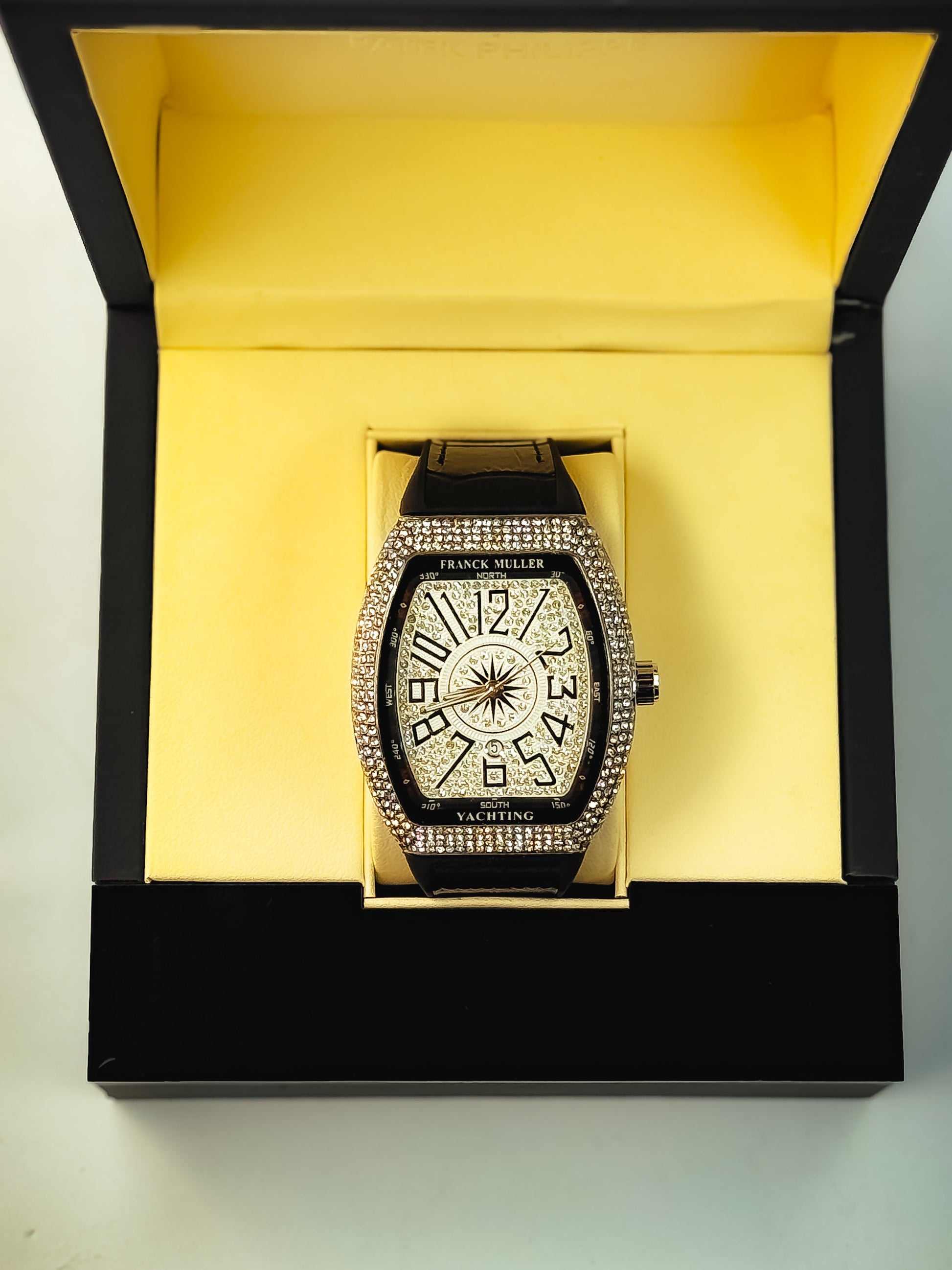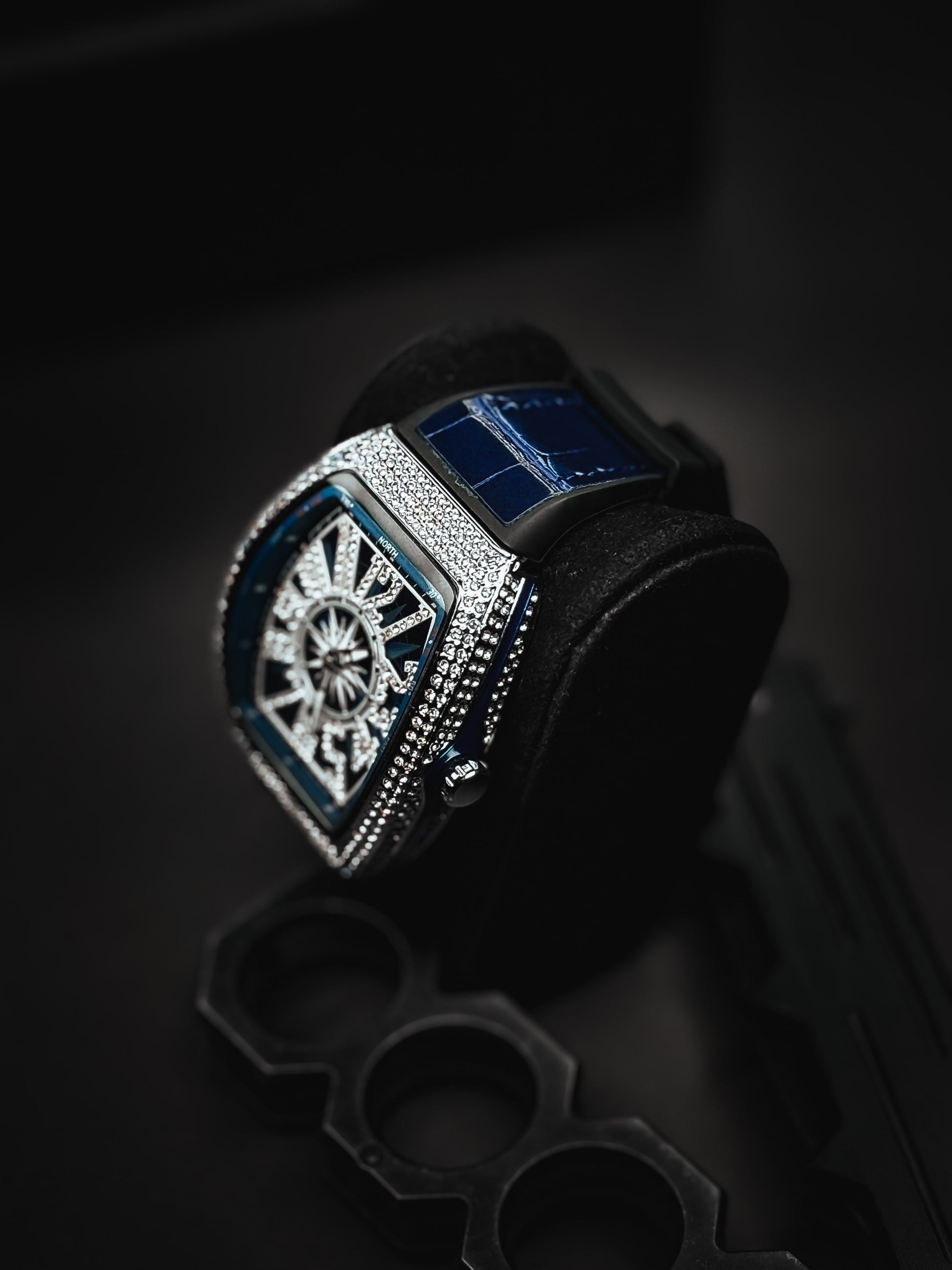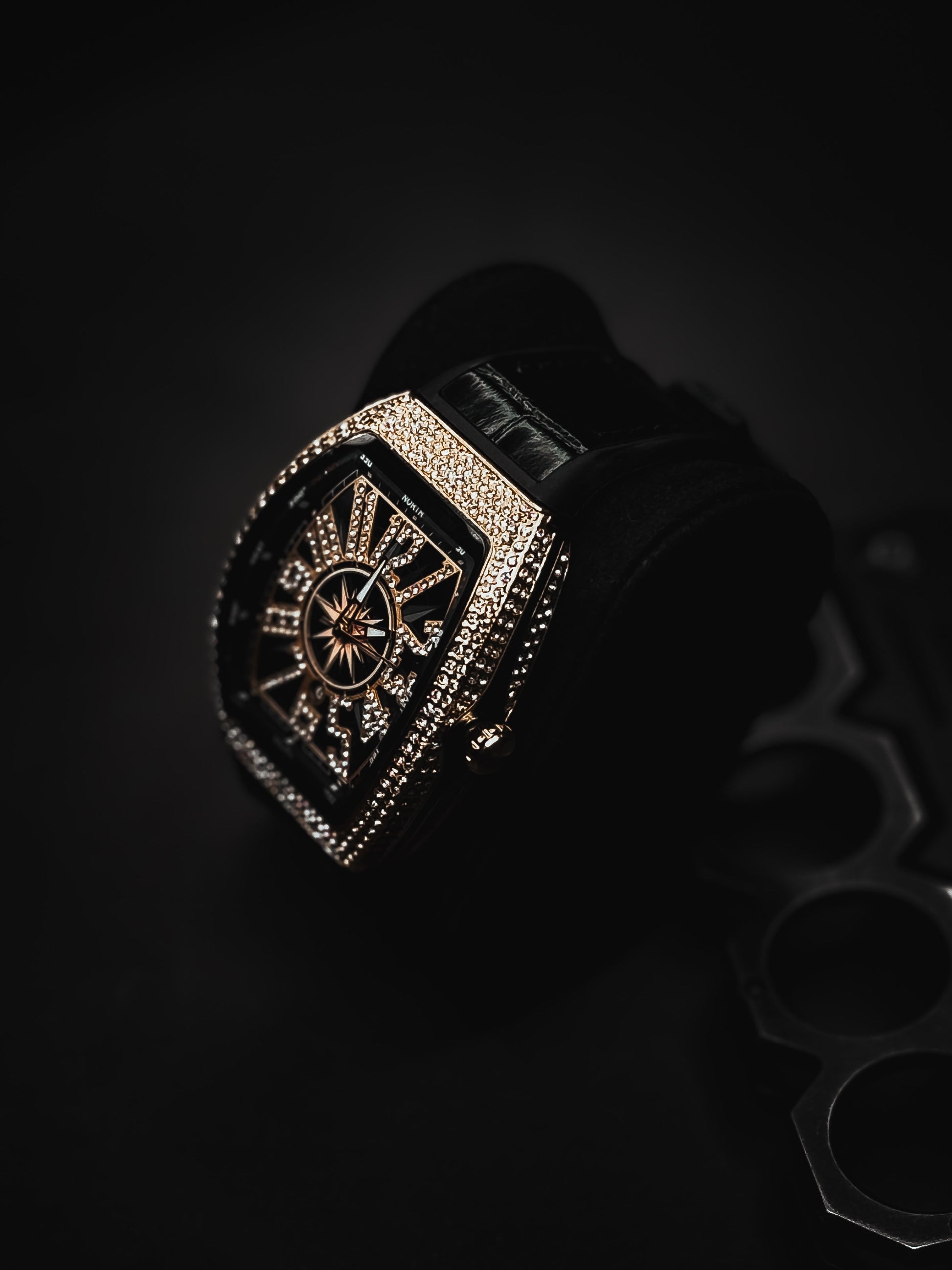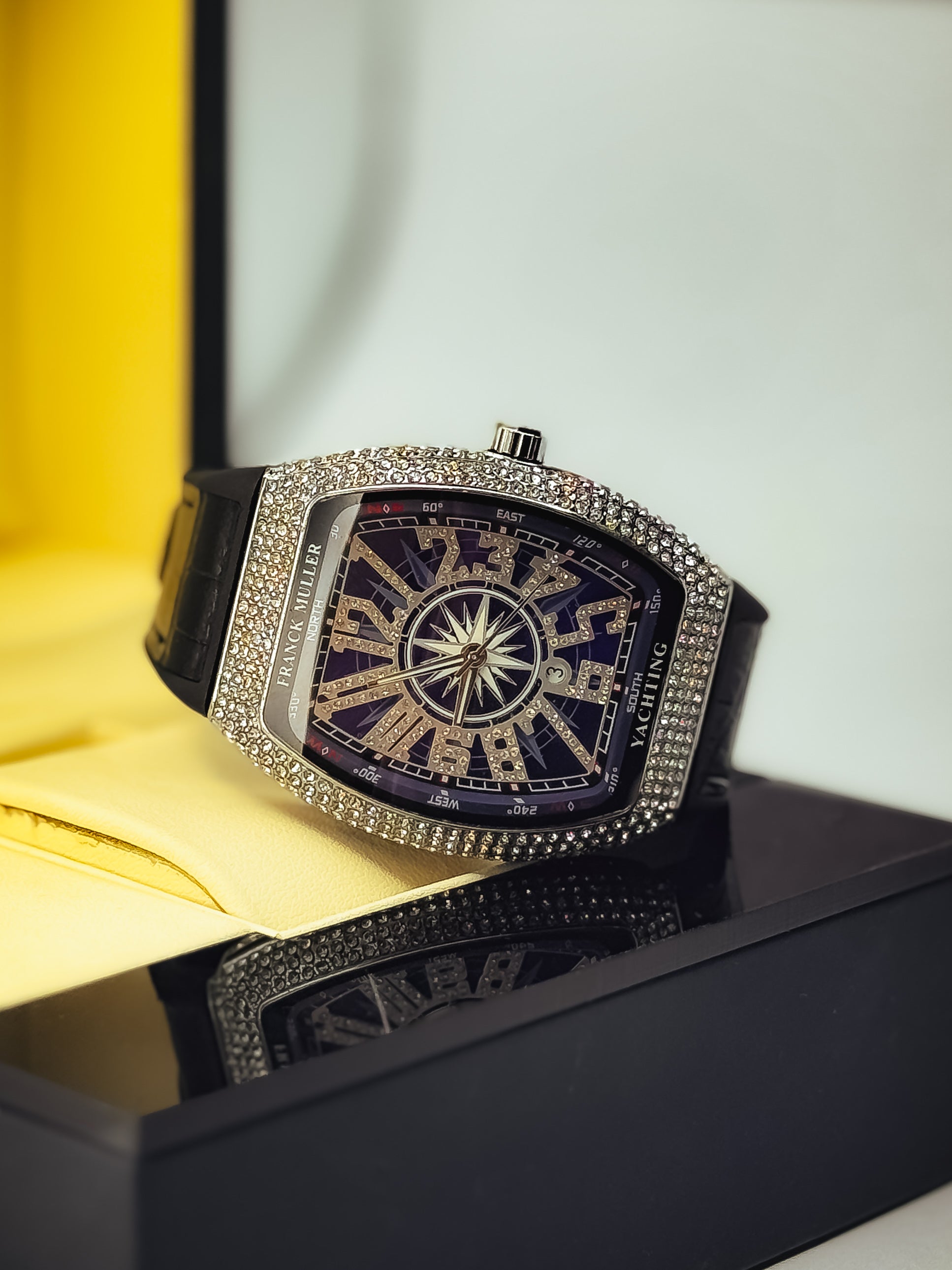 Diamond-drenched dial made to blind the crowd.