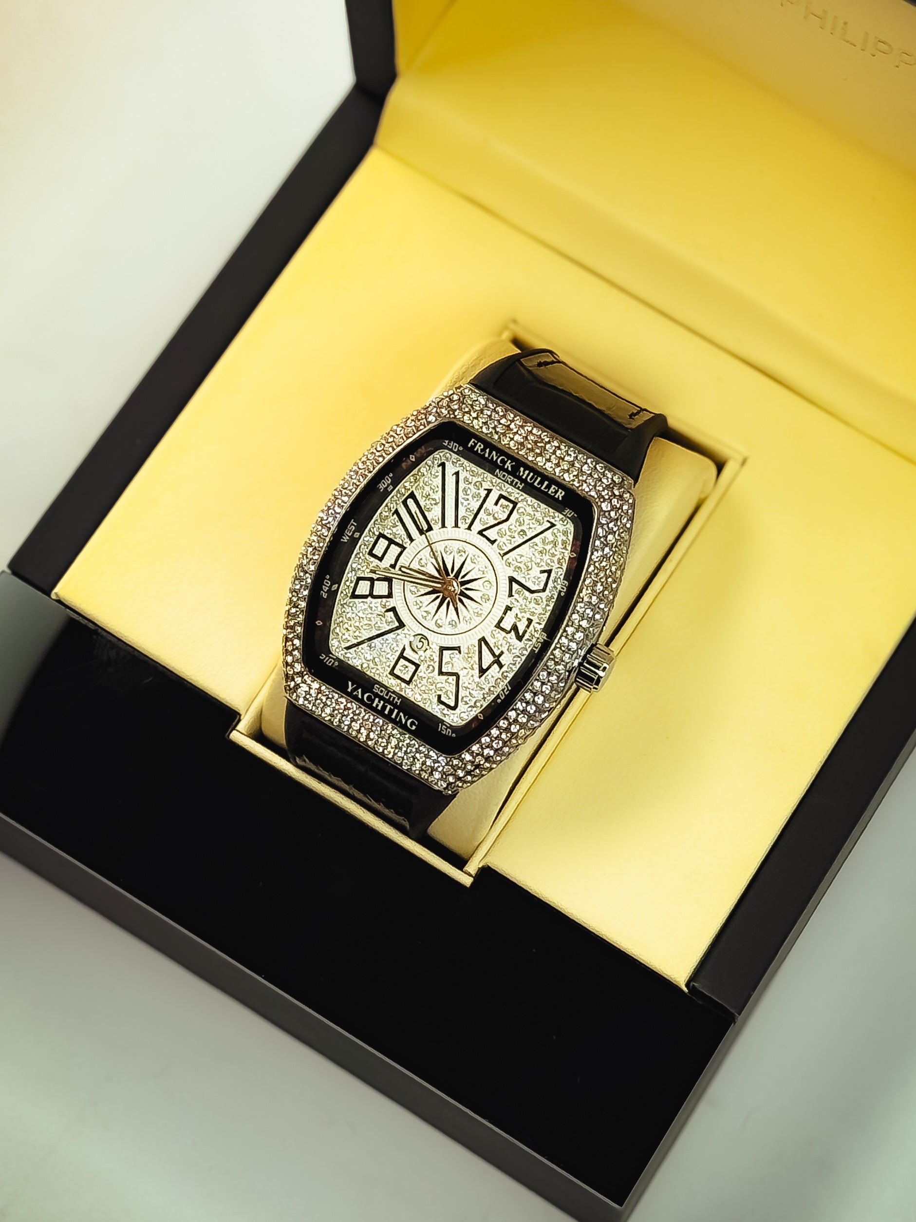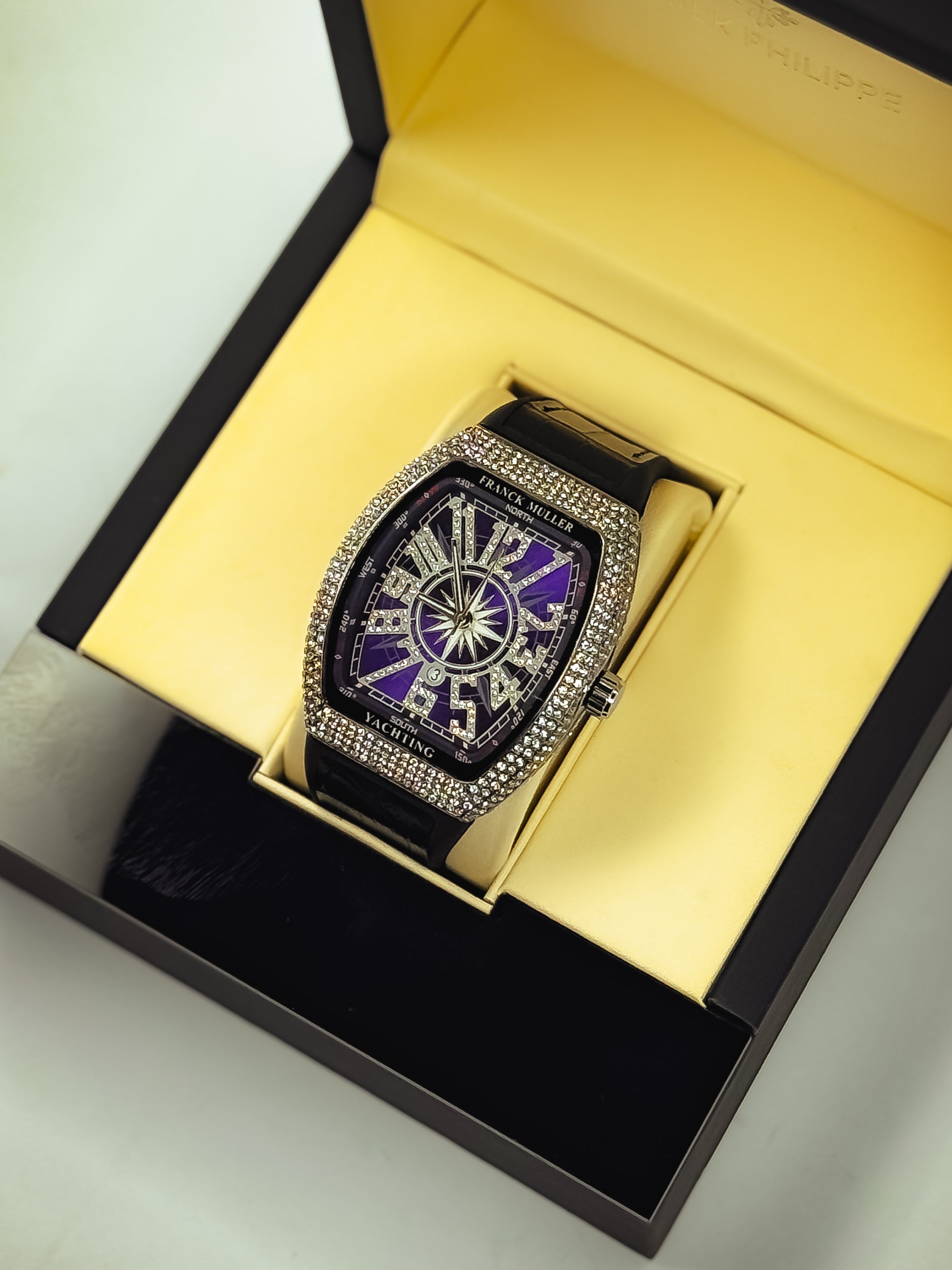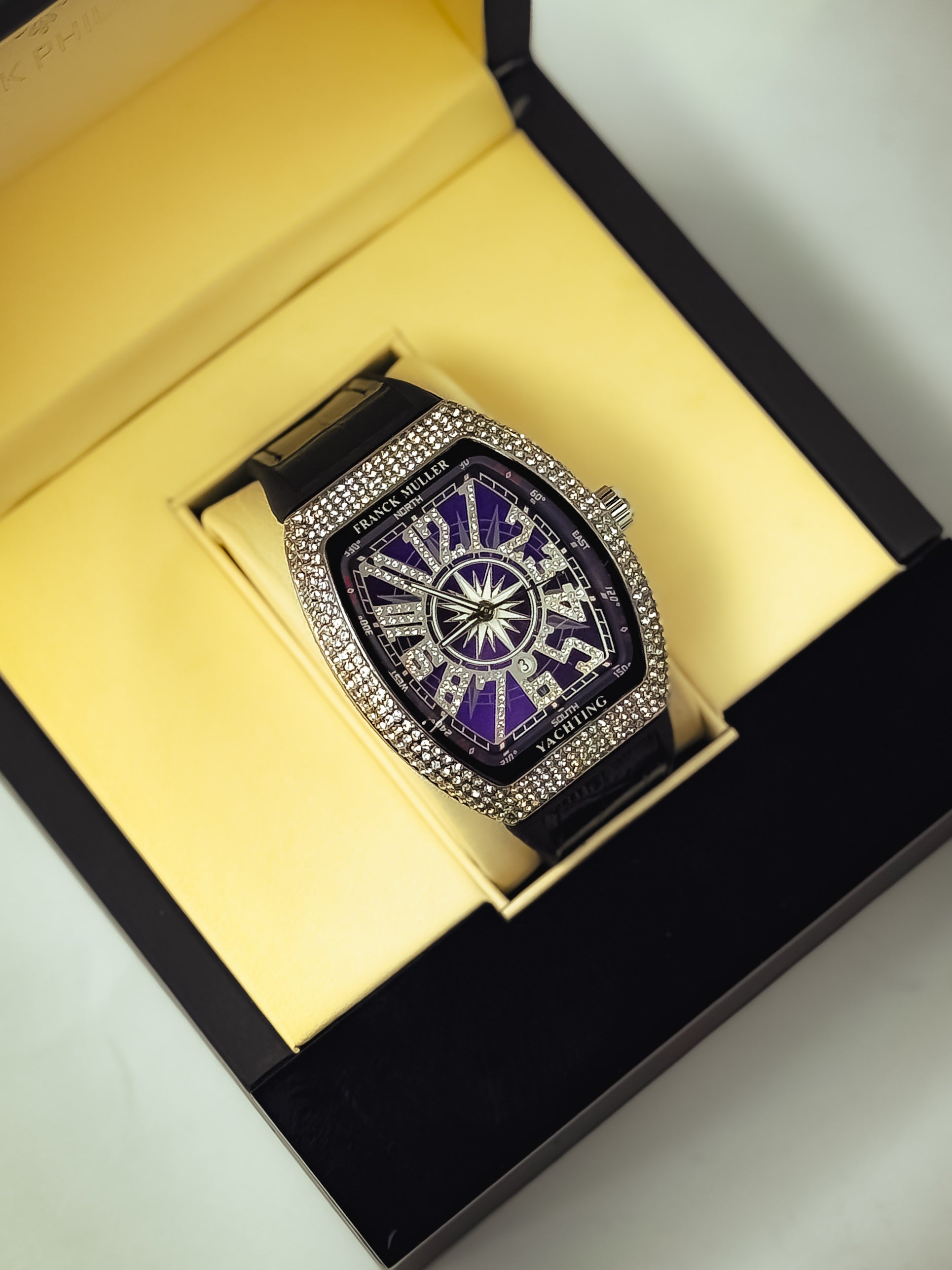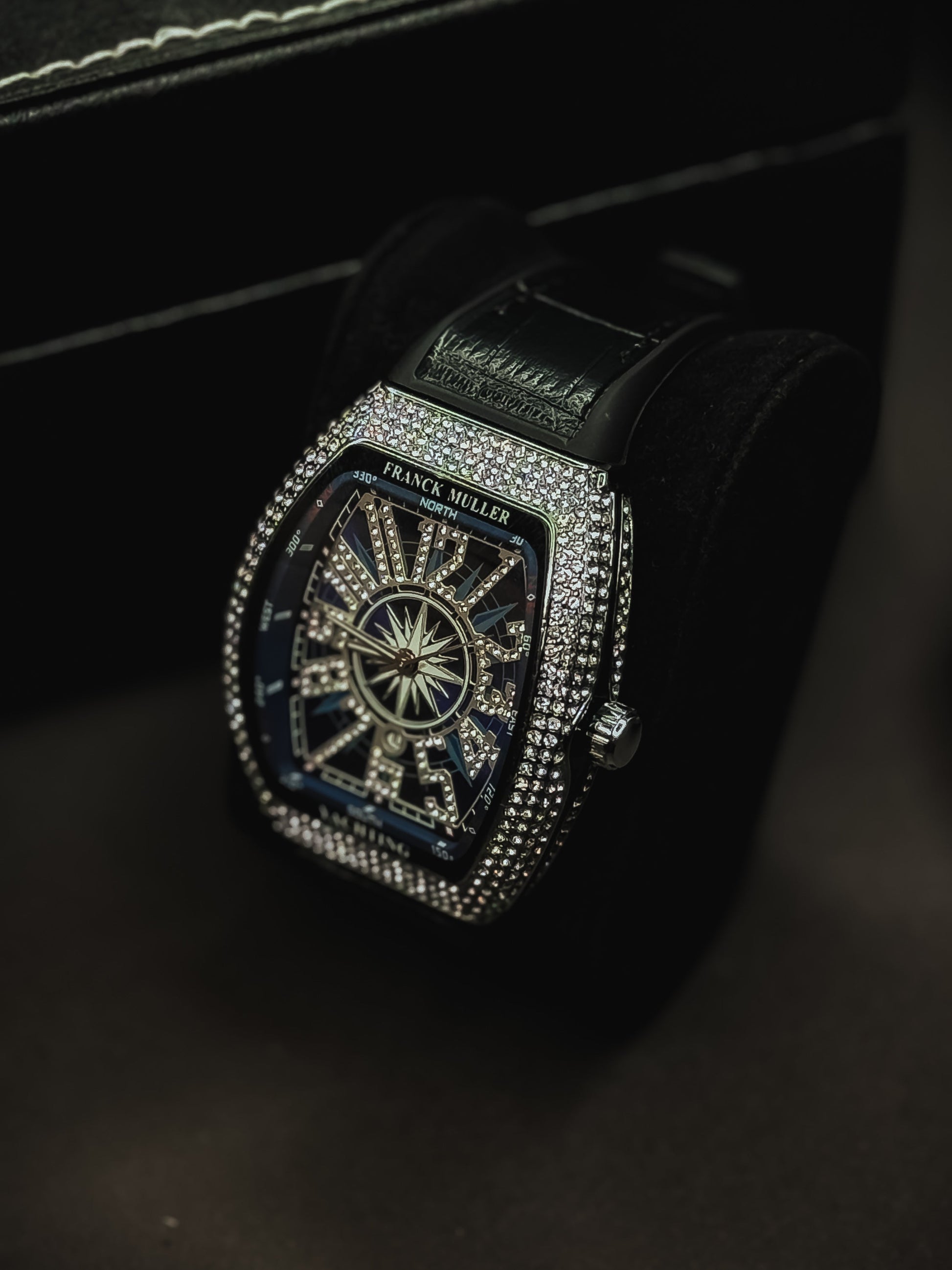 Diamond-drenched dial made to blind the crowd.