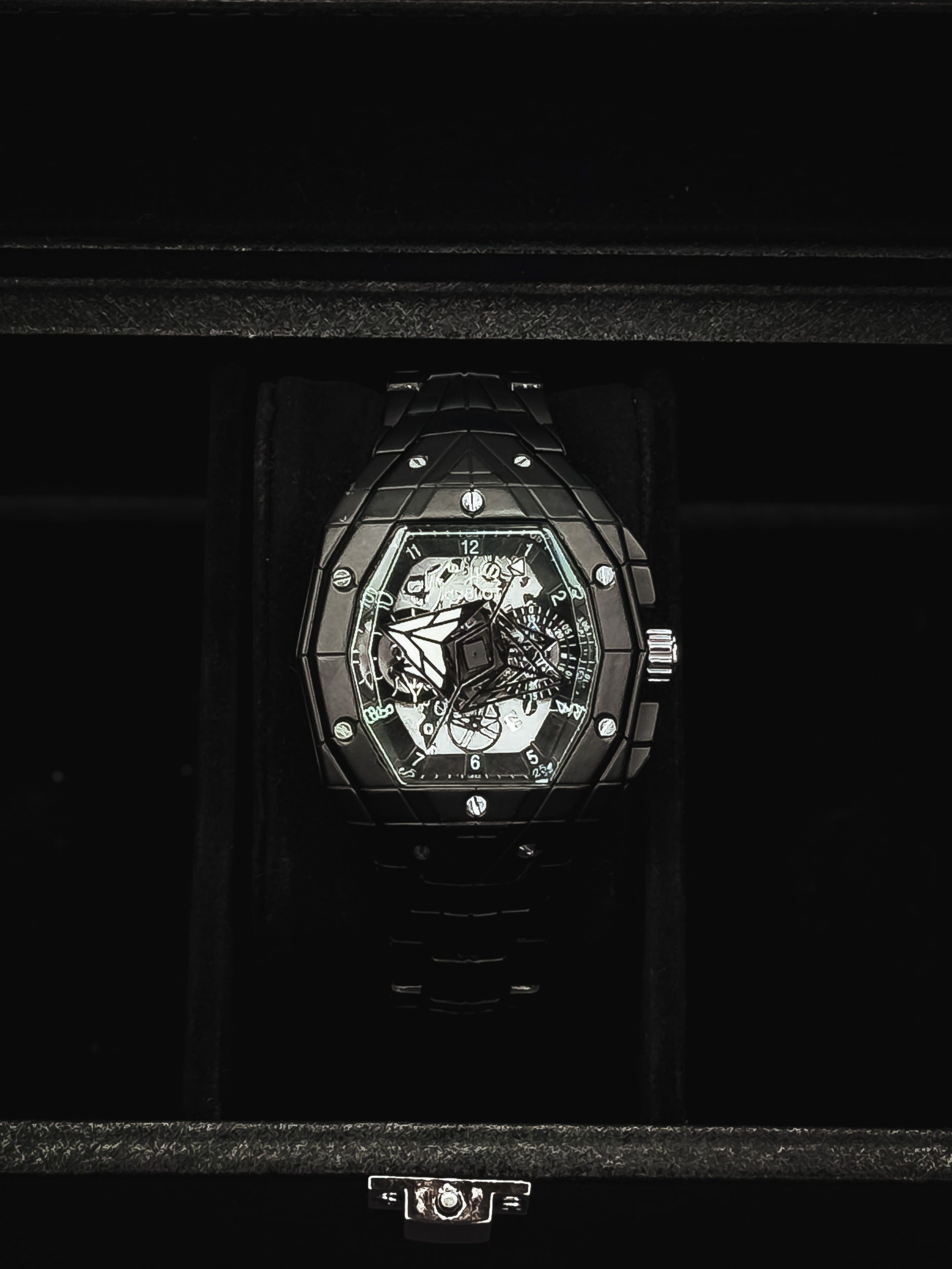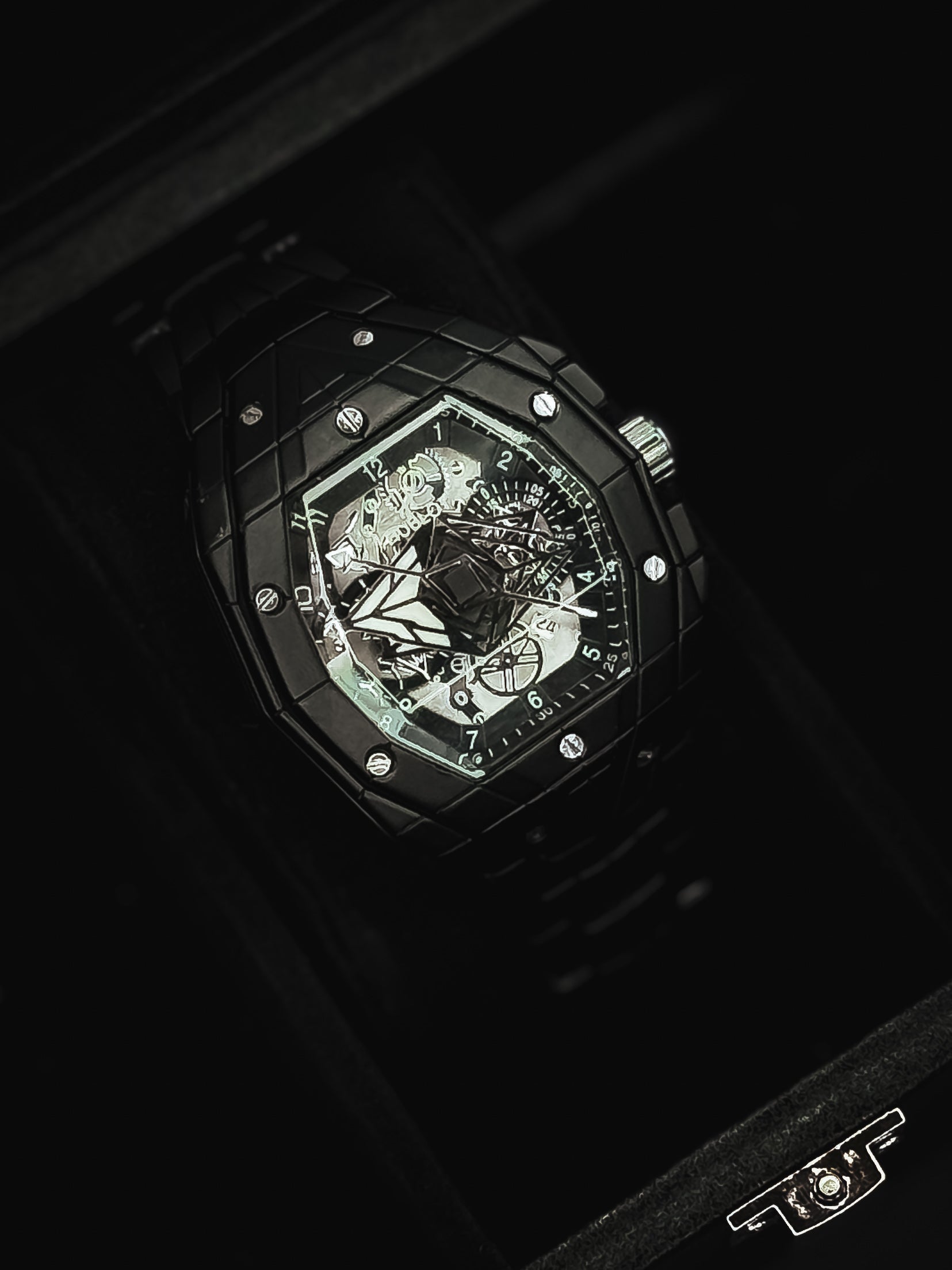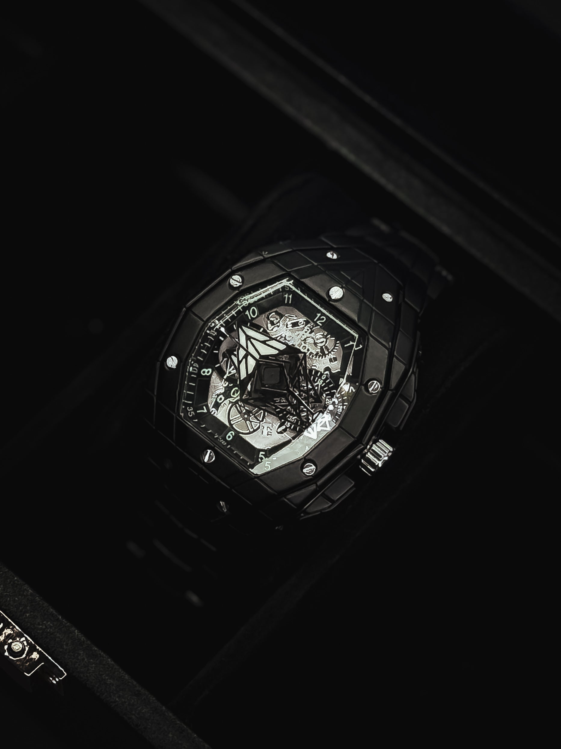 Unleash your inner force with the Hublo Spider Core Watch — a masterpiece of bold engineering and cutting-edge design. With its sharp geometric frame, skeletal dial, and deep black finish, this timepiece captures the essence of modern masculinity and unstoppable energy.