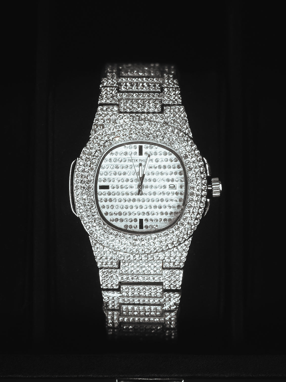 โจ Fully Iced Out Design: Encrusted with high-quality stones across the dial, bezel, and strap โ delivering a shine that rivals red carpet lights.