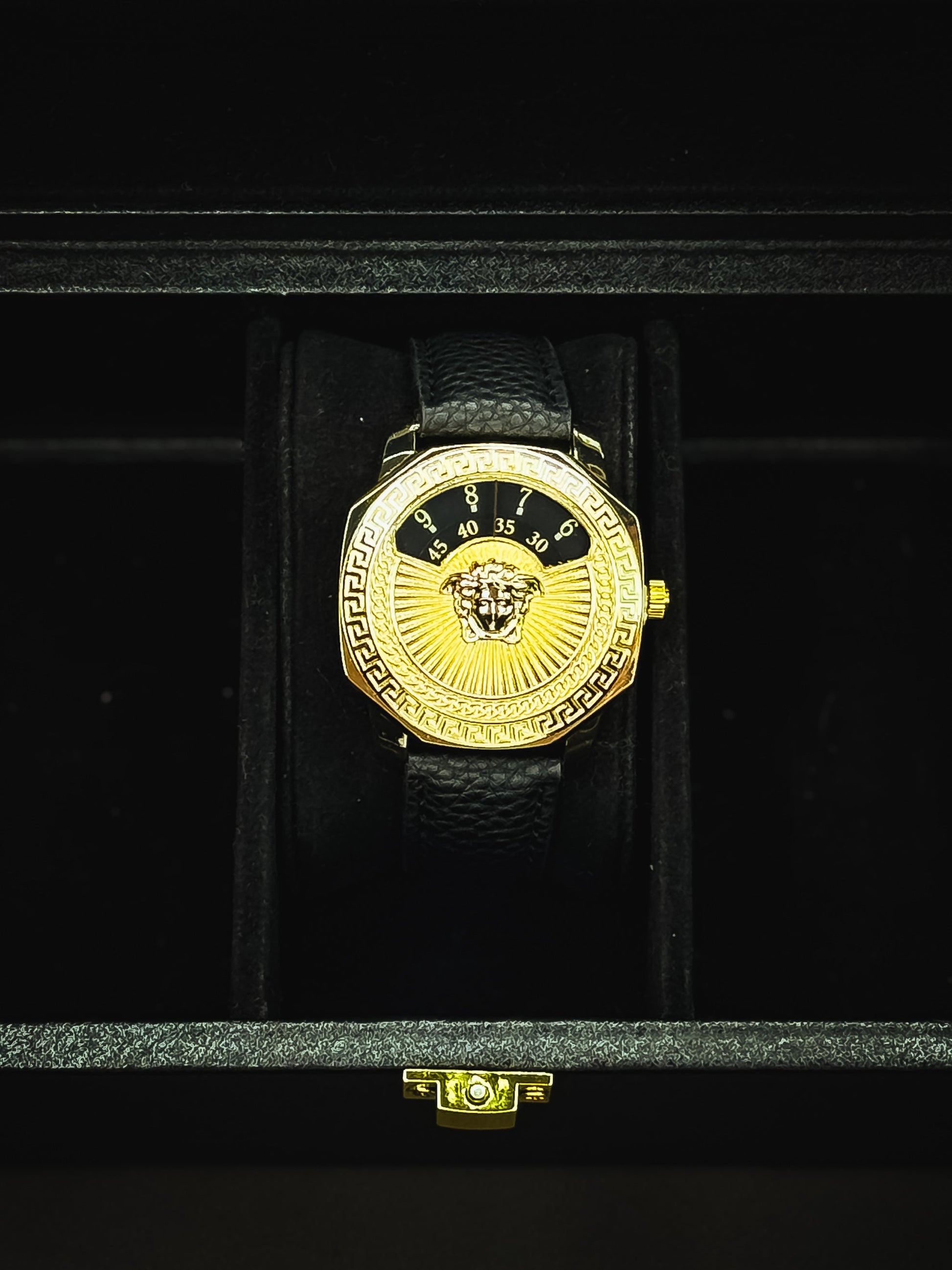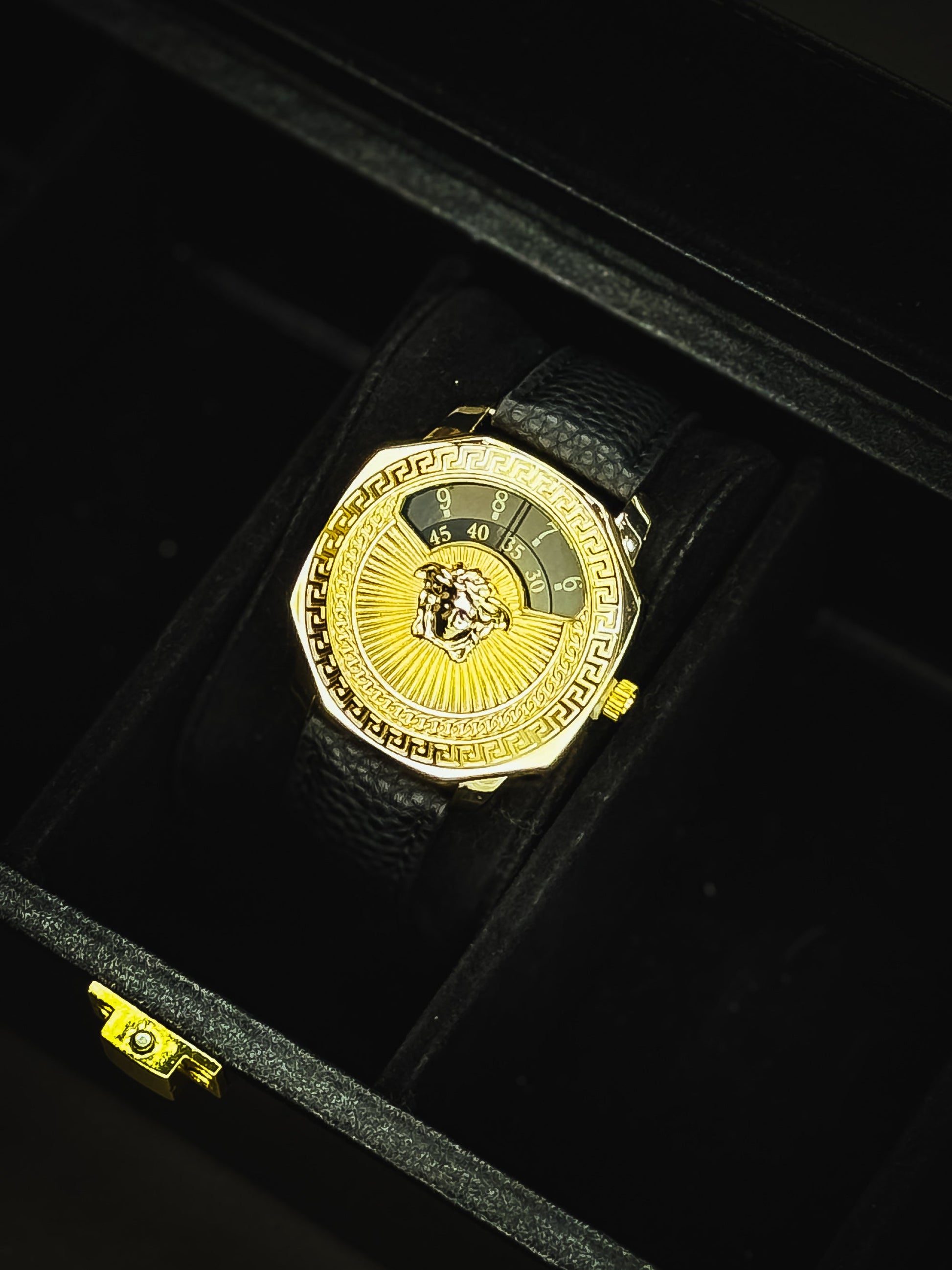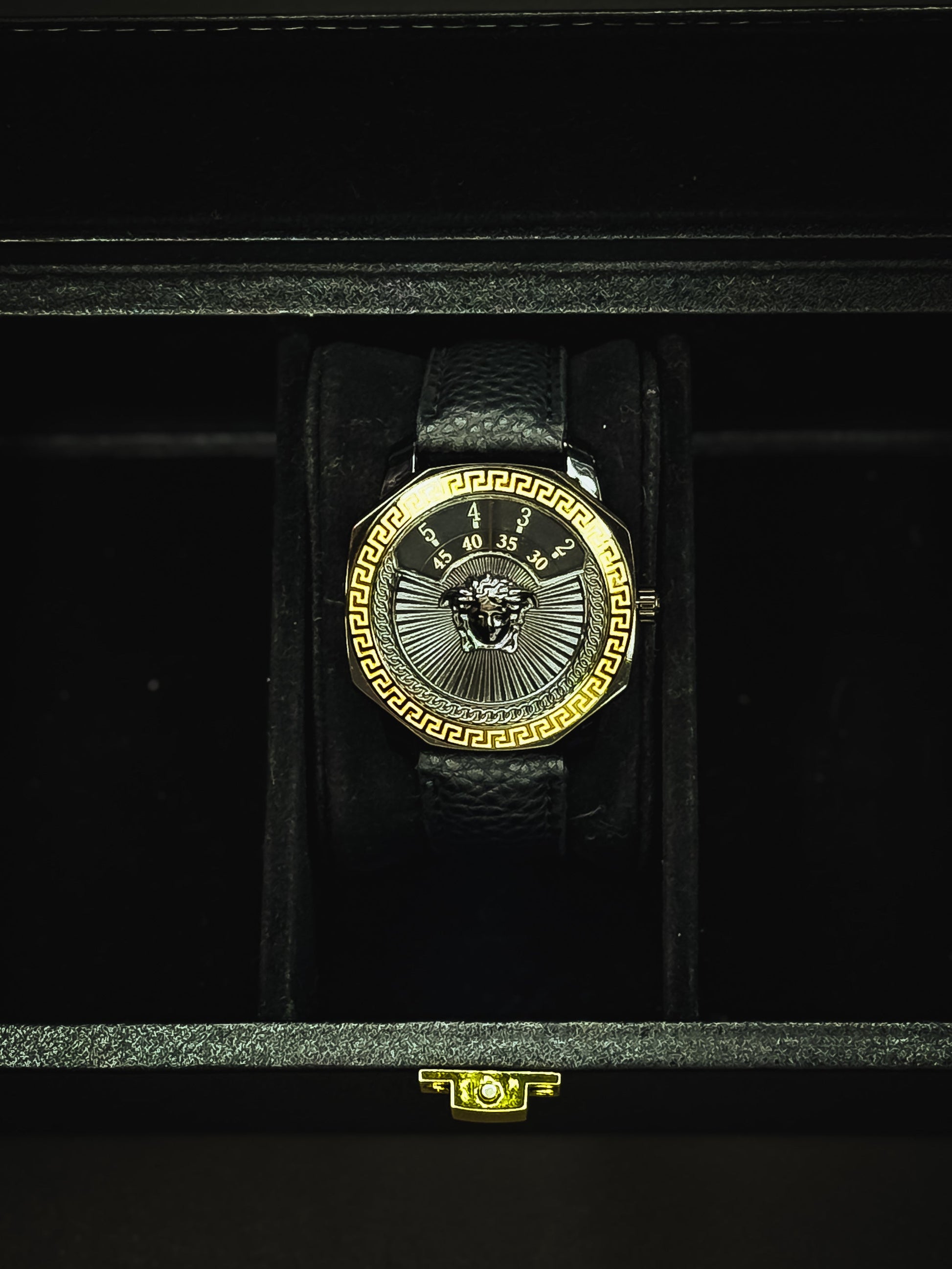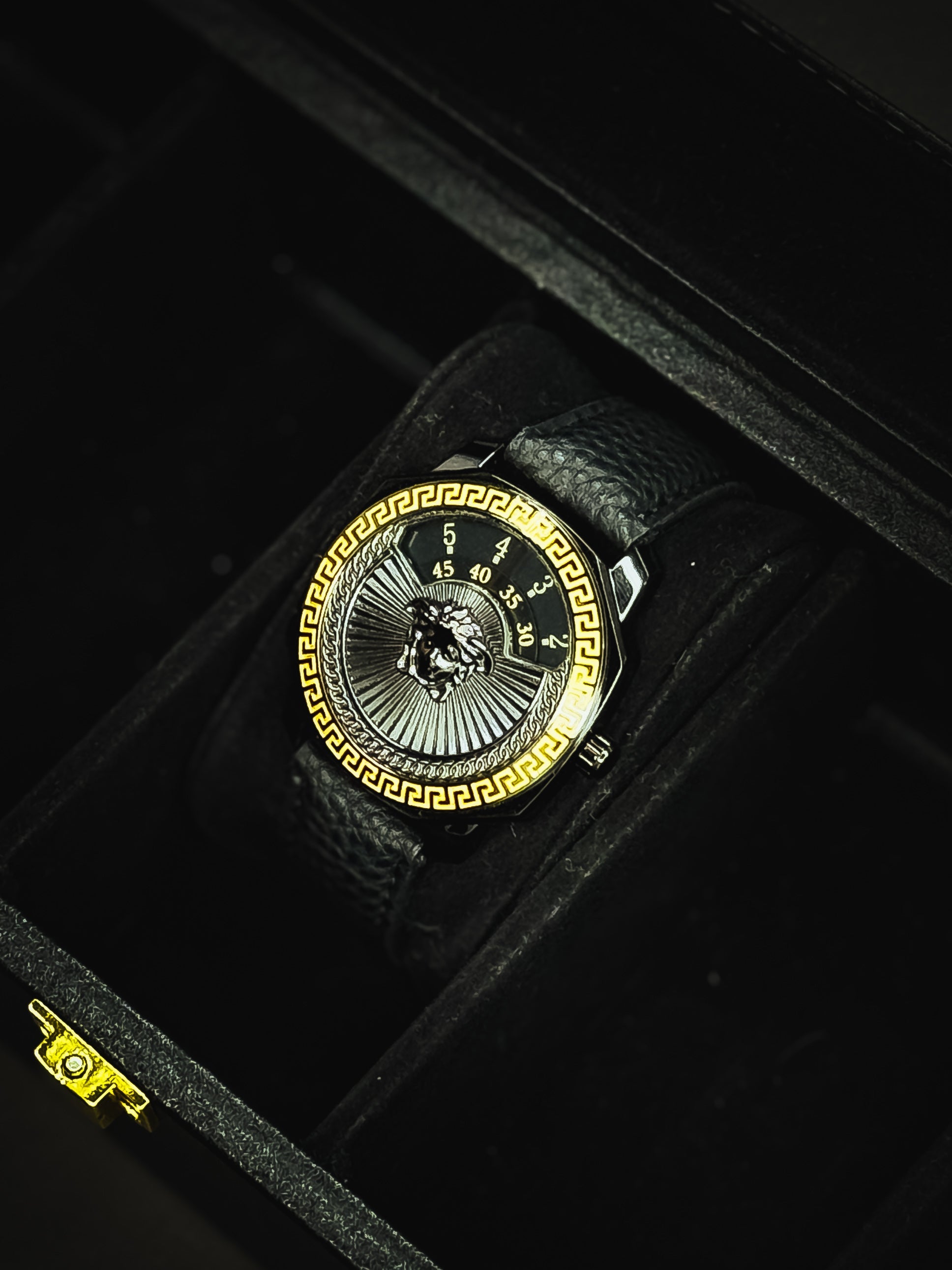 Unleash the bold. The Medoro Legacy Noir Watch is crafted for those who command the room without saying a word. Featuring a rich black dial, golden Greek bezel, and a majestic lion emblem at the center, this piece blends myth and modernity into one powerful statement.