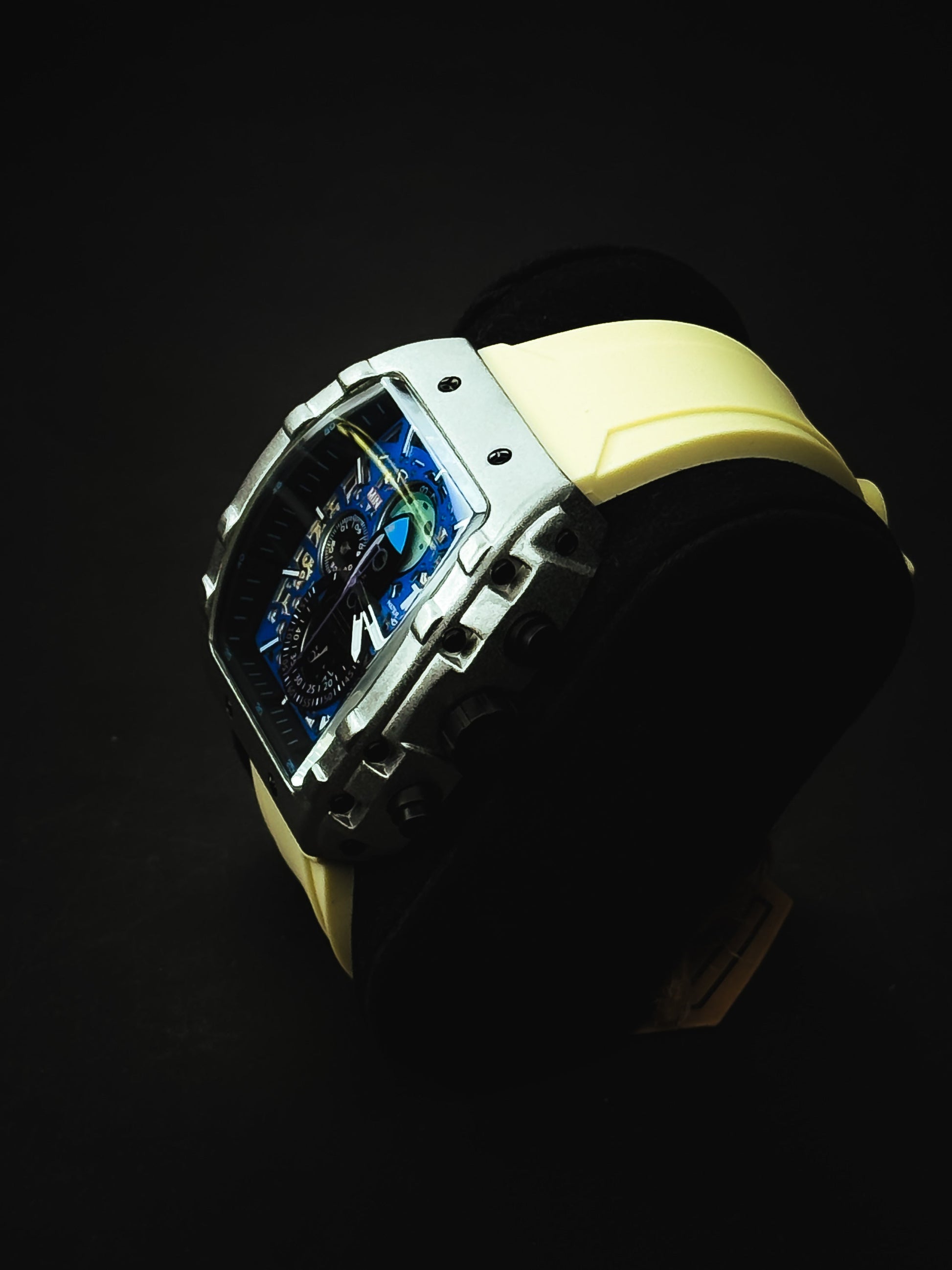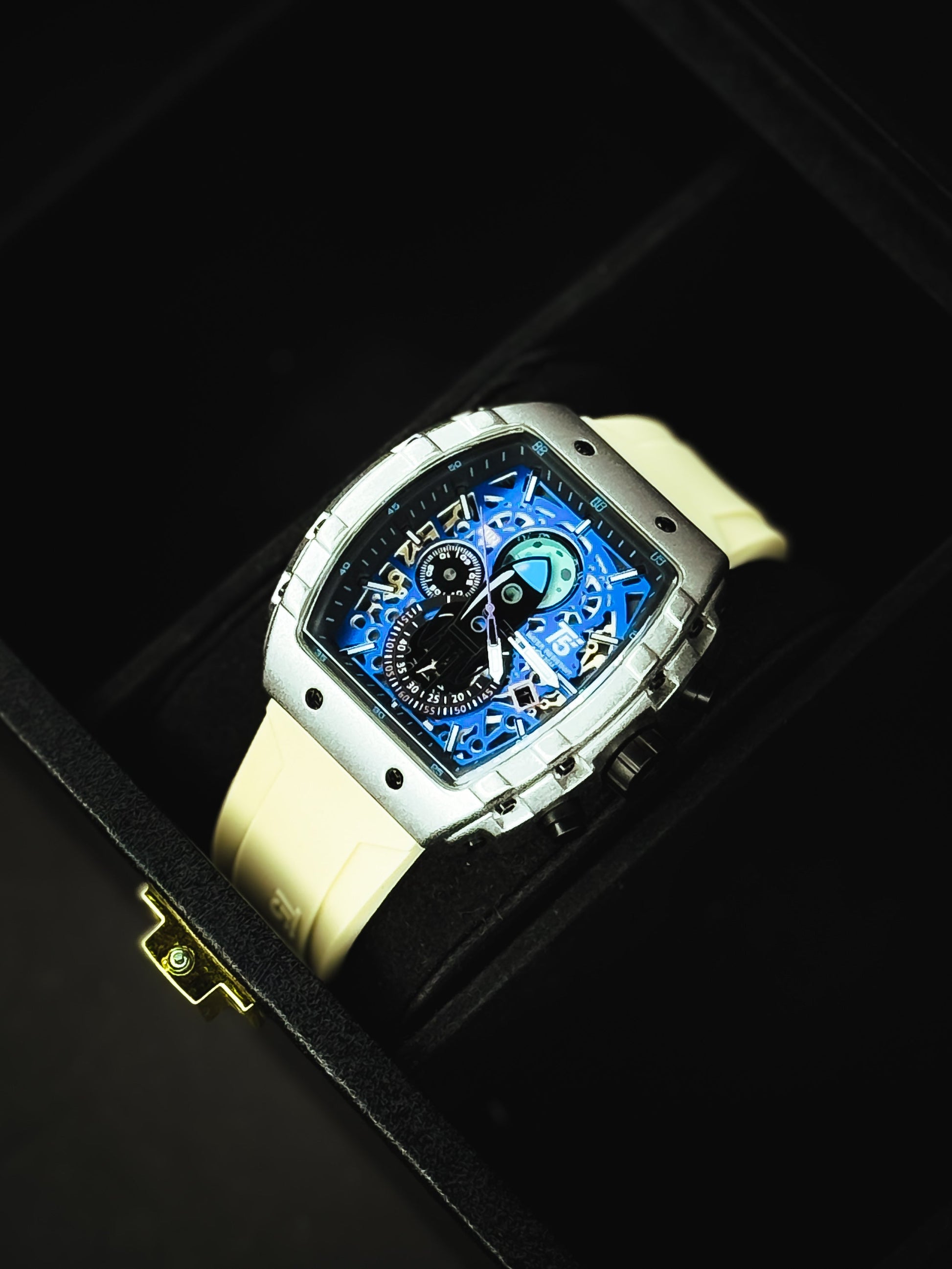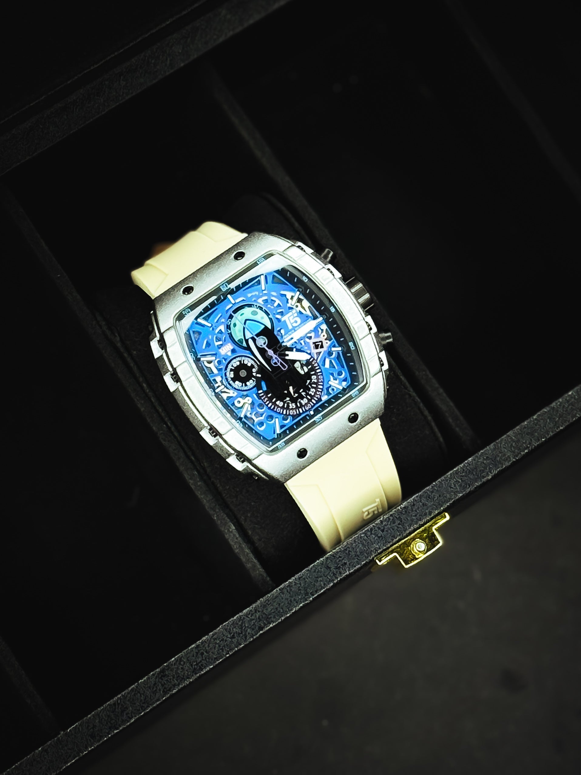 Where style meets precision β a bold fusion of silver steel and electric blue mechanics.